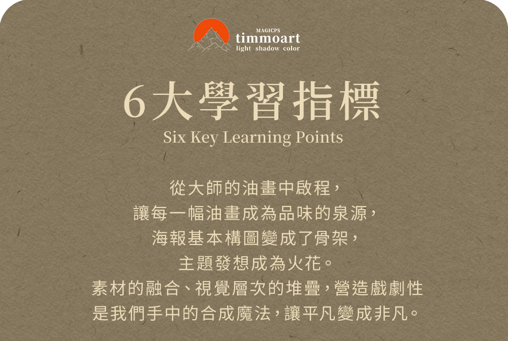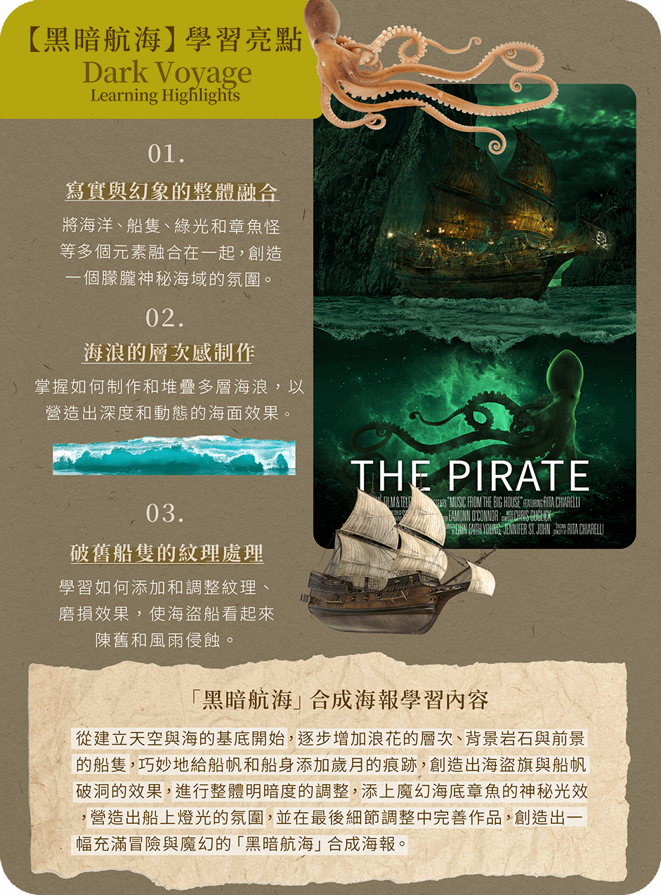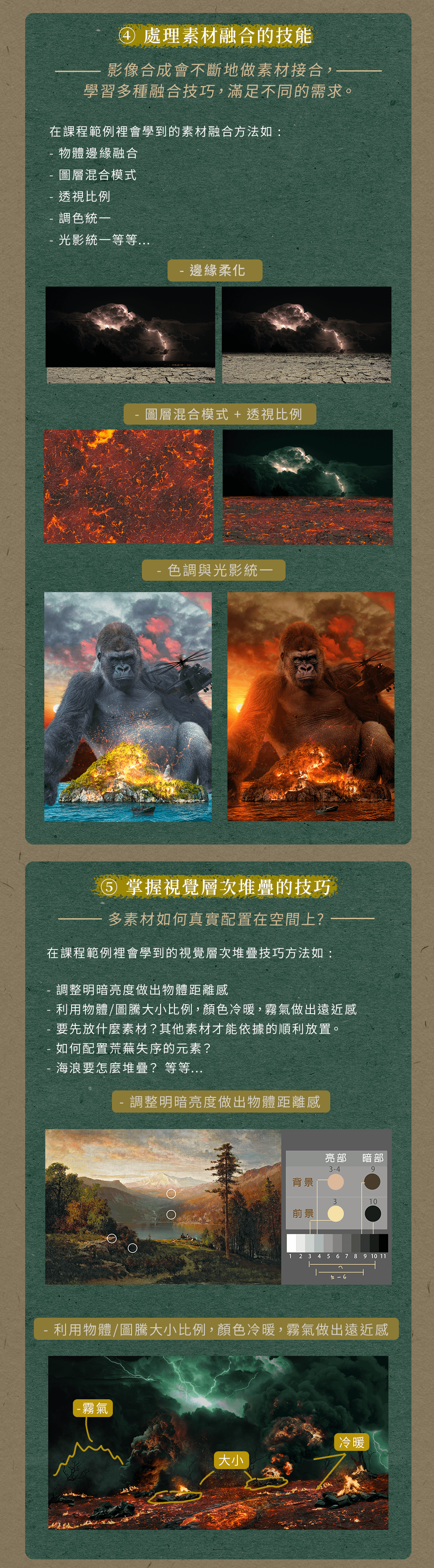這堂《Photoshop 海報影像合成 - 從構思到實作,逐步帶你完成具有吸引力的故事感海報》,目標製作吸引人的影視海報。課程內容包含欣賞大師油畫、基本的海報合成構圖、主題海報發想、處理素材融合的邏輯、掌握視覺層次堆疊的技巧、營造戲劇性的效果等方面,把各種元素融合成充滿故事感和戲劇張力的海報。