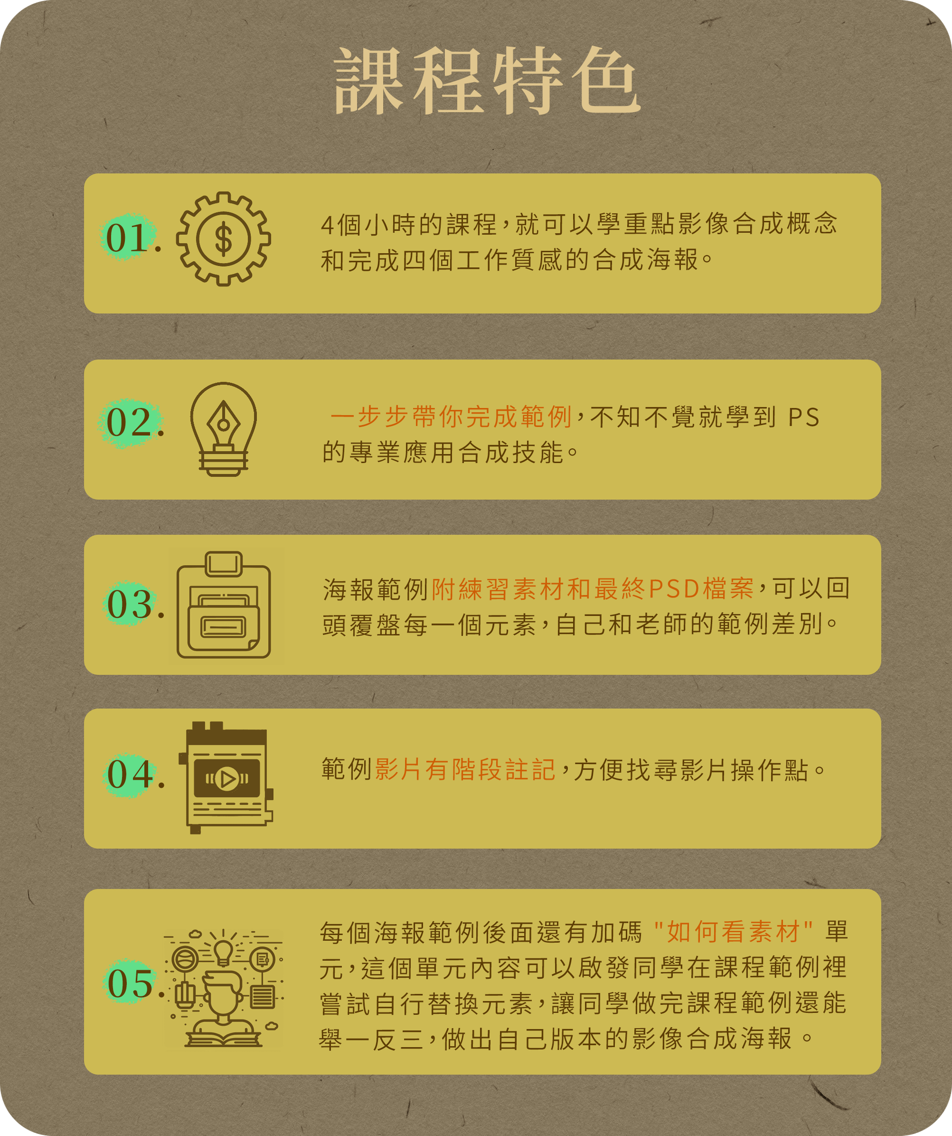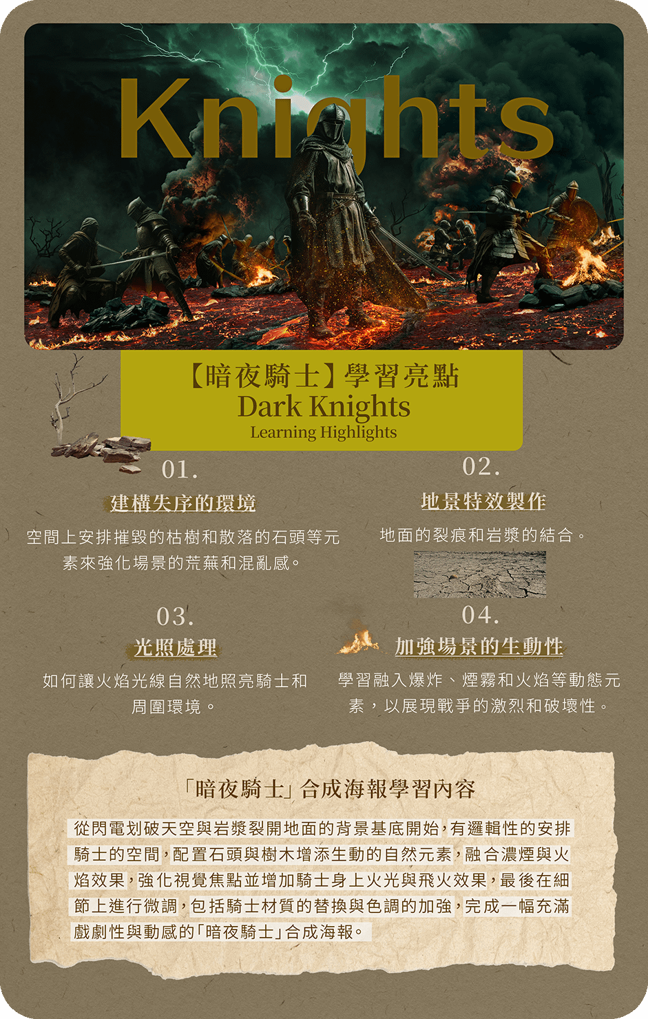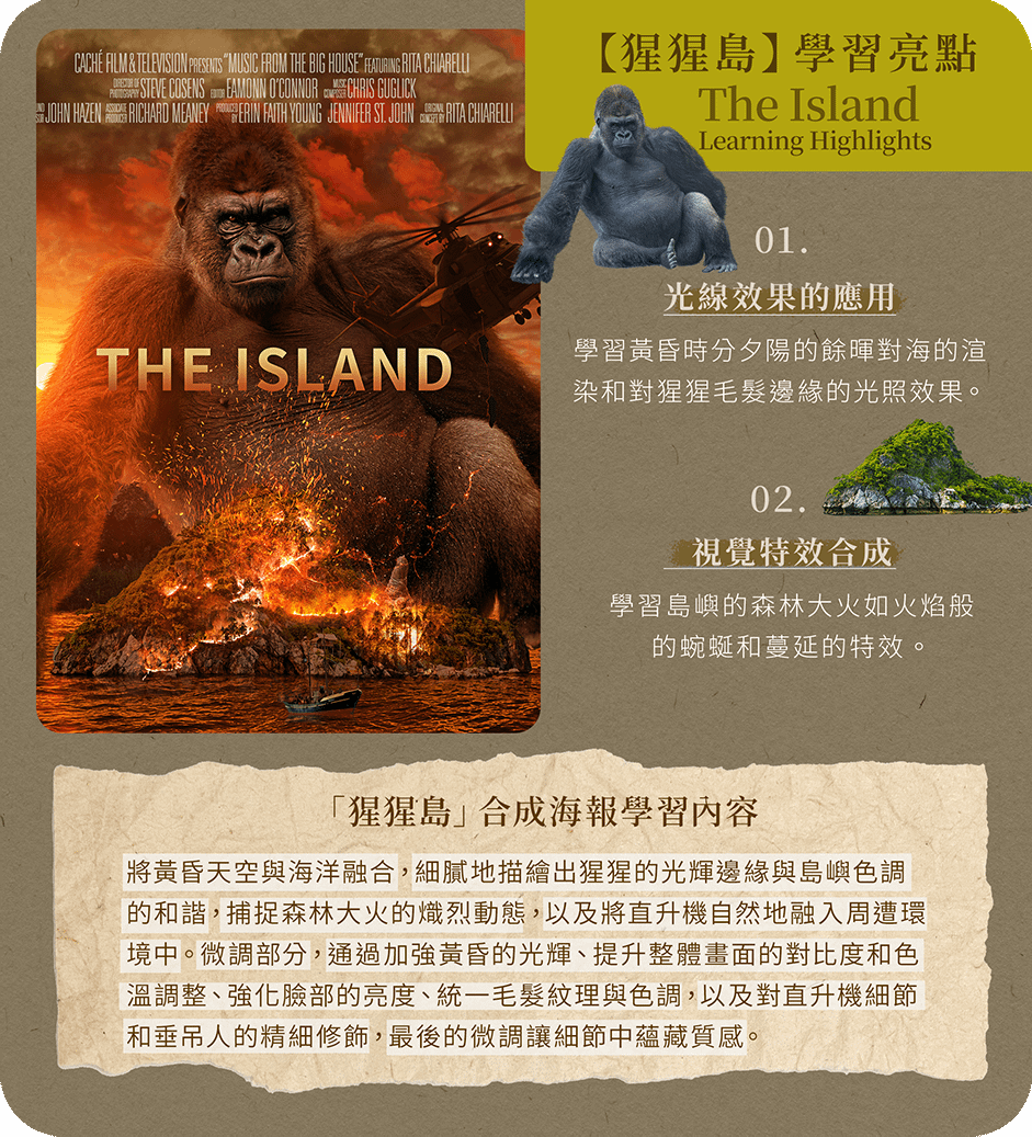 這堂《Photoshop 海報影像合成 - 從構思到實作,逐步帶你完成具有吸引力的故事感海報》,目標製作吸引人的影視海報。課程內容包含欣賞大師油畫、基本的海報合成構圖、主題海報發想、處理素材融合的邏輯、掌握視覺層次堆疊的技巧、營造戲劇性的效果等方面,把各種元素融合成充滿故事感和戲劇張力的海報。