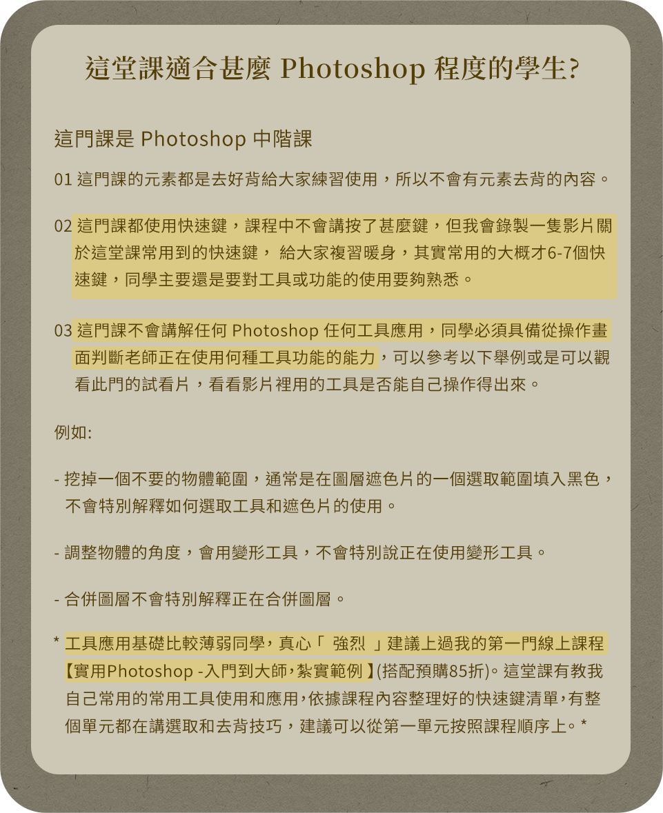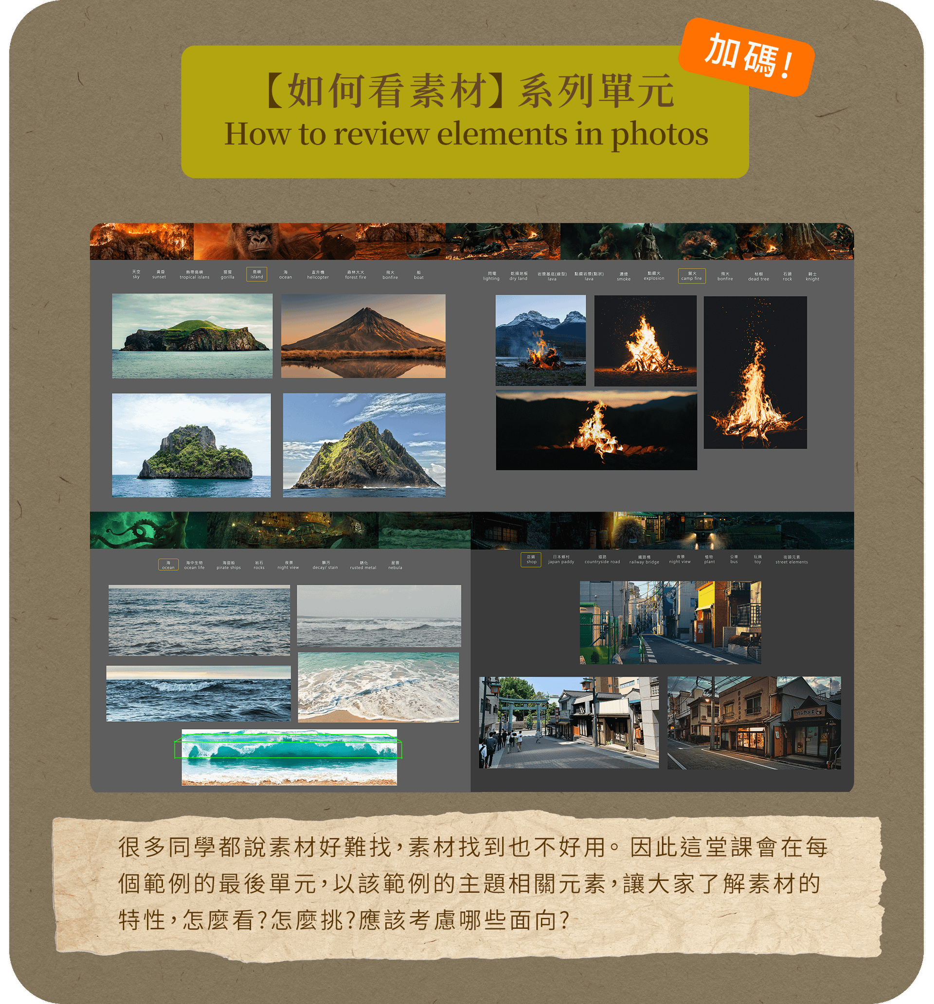 | Q7: 自己找的素材都不好 | A7: 每個範例後會有一個單元會有以範例相關的主題素材,找素材怎麼看會讓合成比較輕鬆一點 |