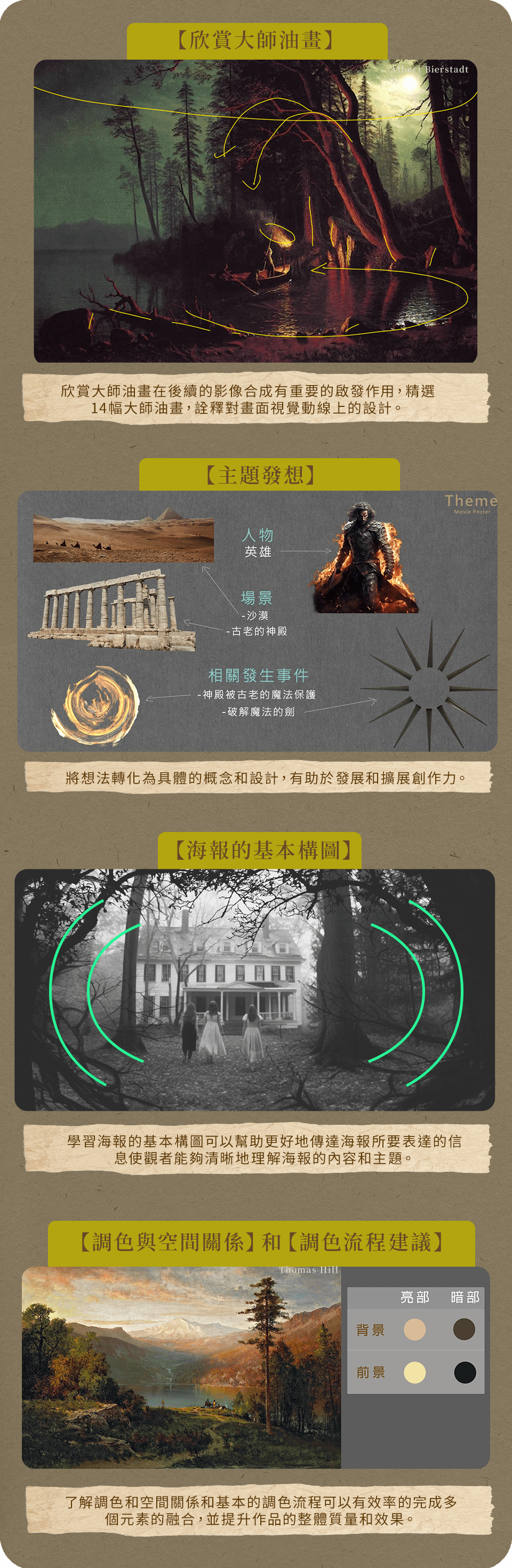 | Q3: 畫面很多素材看起來很雜,不知道怎麼視覺引導 | A3: 欣賞大師油畫的手法和海報常見的視覺引導 |